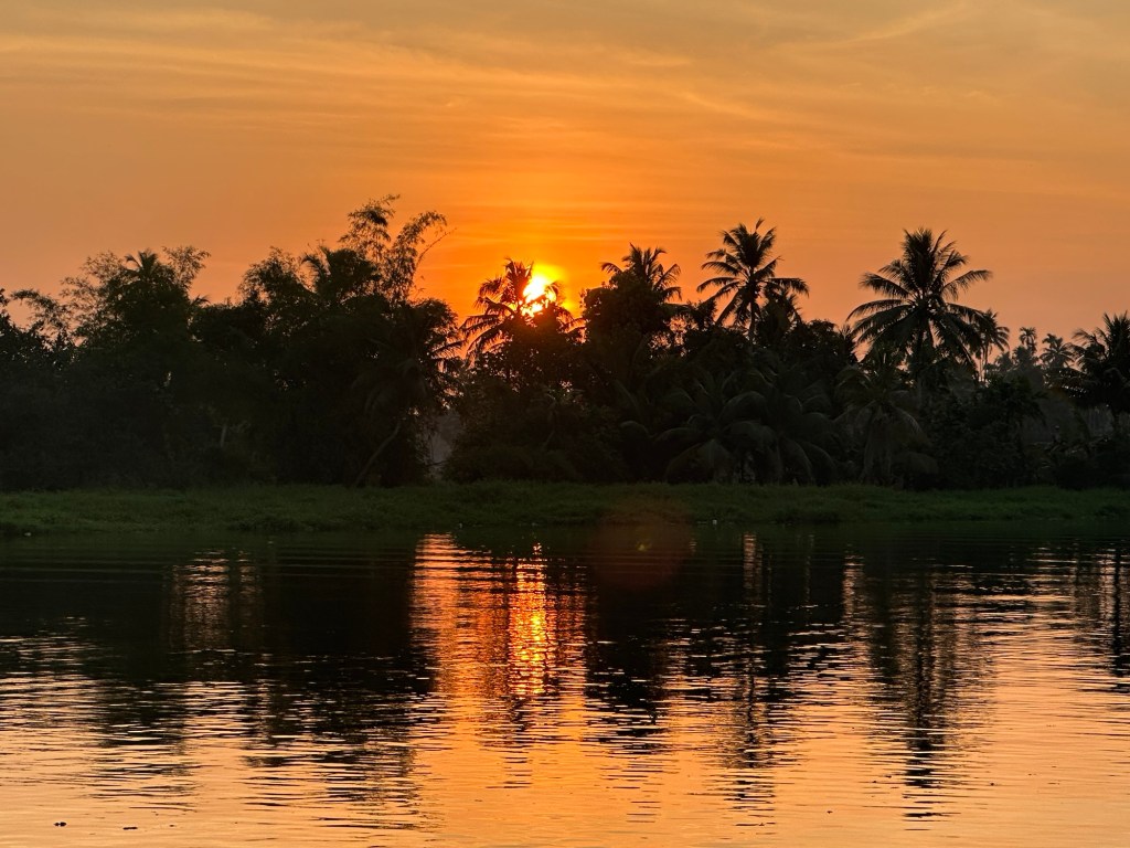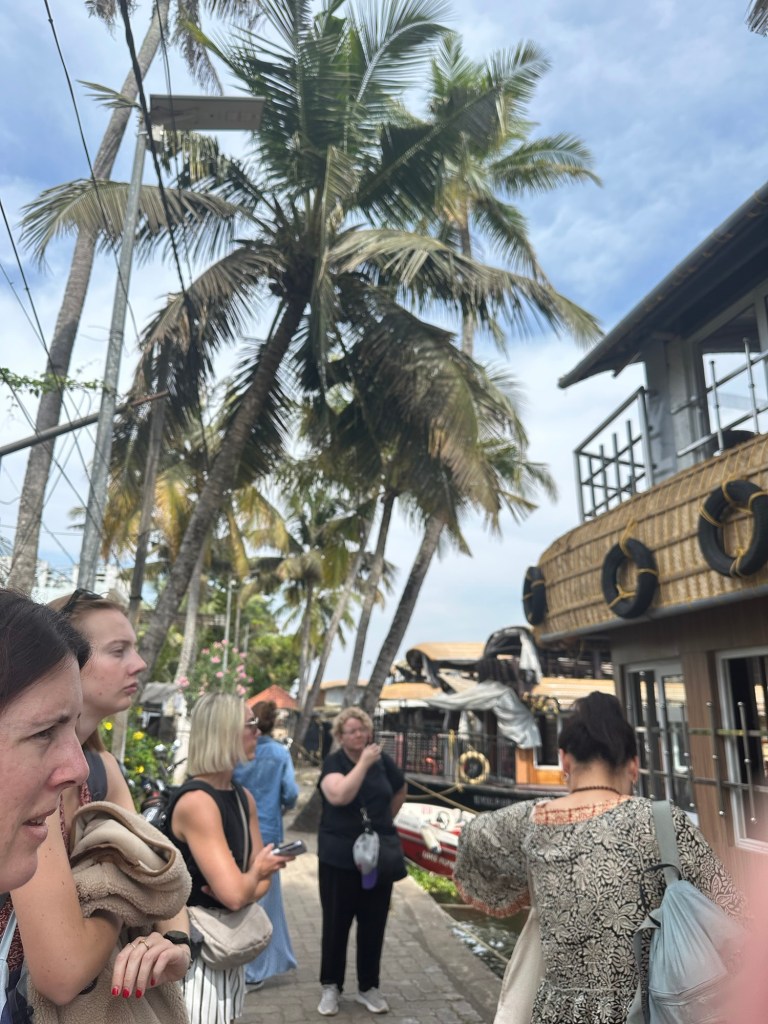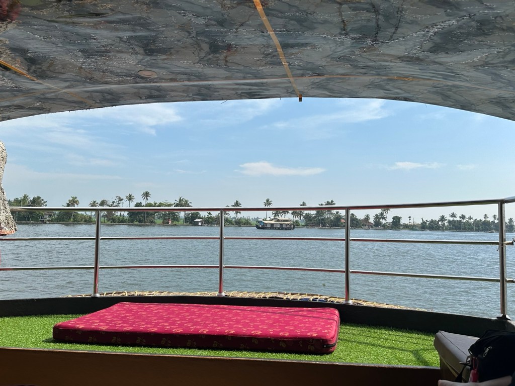 We arrived at Alleppy And boarded our beautiful houseboat. We floated around all afternoon, enjoying a lunch cooked by the crew. It was a really delightful lazy way to travel. In the shade on the upper deck, with gorgeous scenery all along the way.