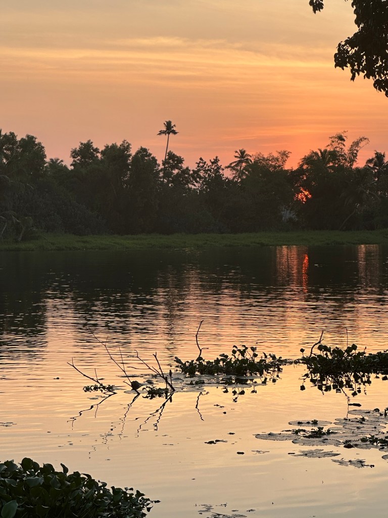 After settling in, we went for a walk along the bund wall on which this village is built, and watched the people who live here washing clothes, bathing, fishing, etc, in the water. They farm ducks here, as well as the usual cows and goats. And grow vegetables and herbs. Also saw lots of water birds. The sunset was lovely.