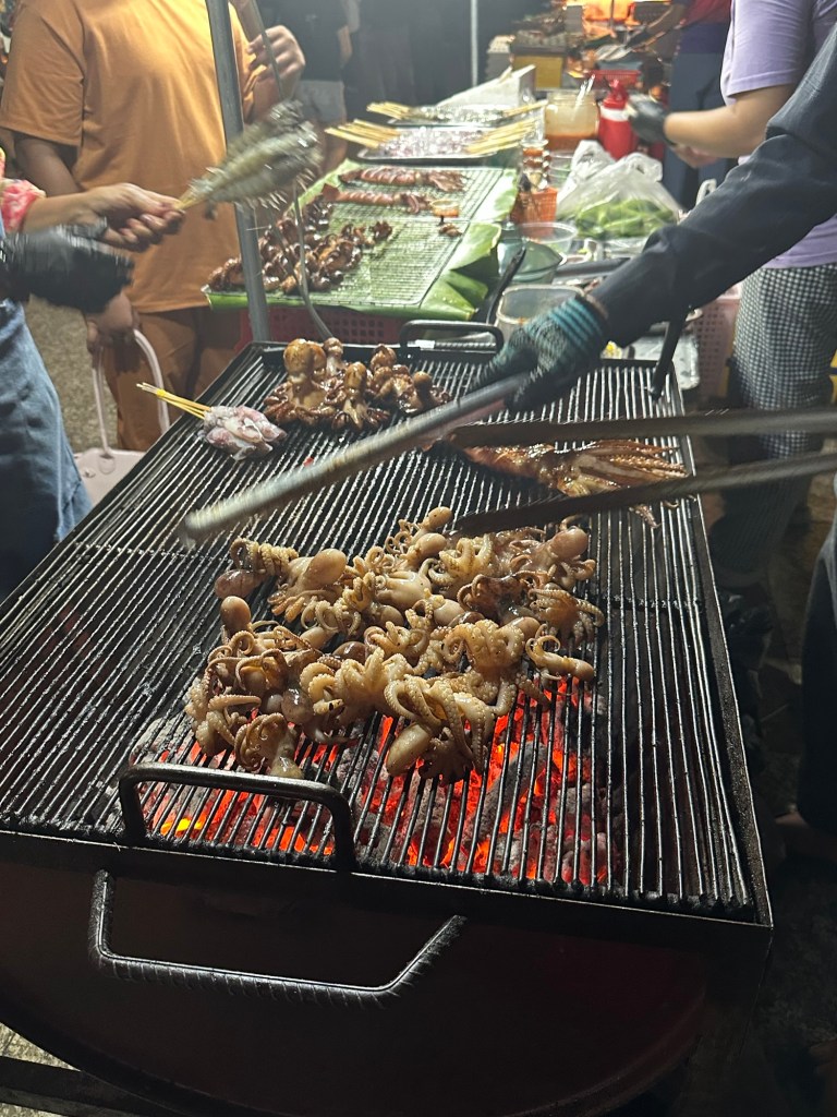 Back to the hotel in tuk tuk, through the “entertainment” district.Dinner in a restaurant near the hotel. Amok chicken. Yum.