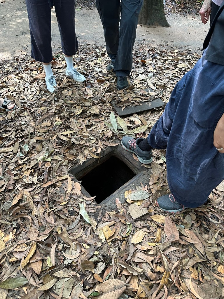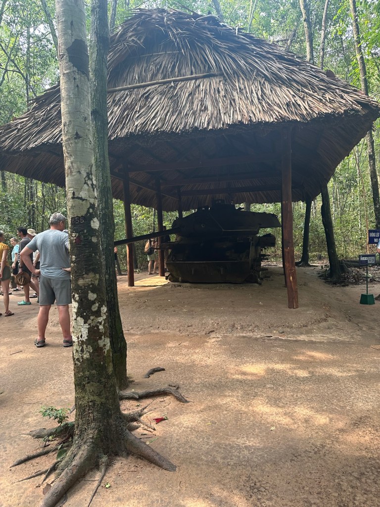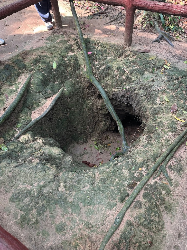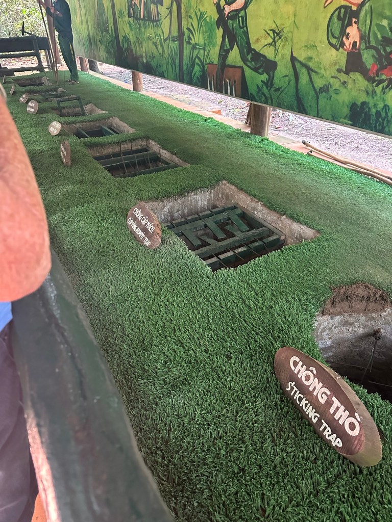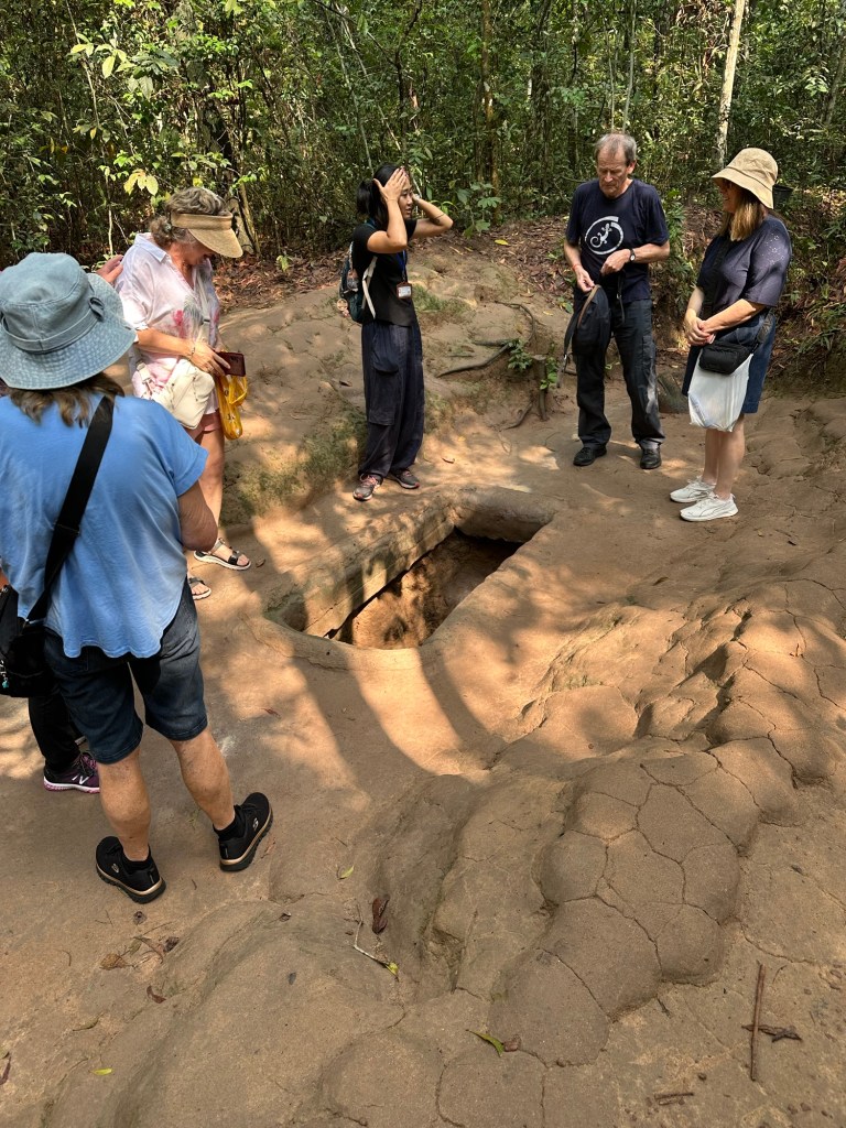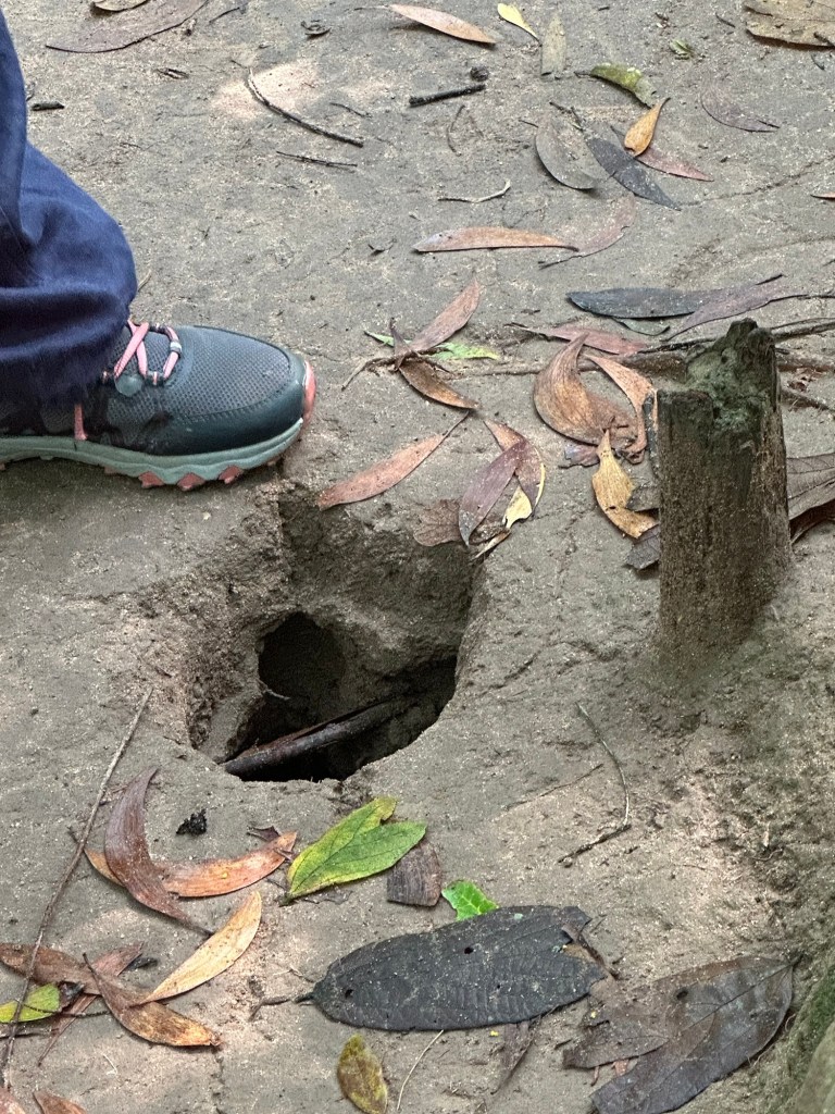 Arriving at the tunnels we were taken to see the various entrances and exits to the tunnel complex, and shown all the techniques the fighters had to use to avoid detection and capture. We walked around among bomb craters in the jungle, and because there is a shooting range there for tourists, you also have the appropriate sound effects.