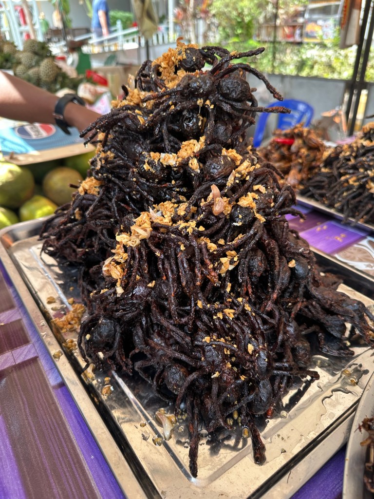 A bit further along we stopped to eat spiders, a traditional delicacy. I only had a tiny taste of a leg. Really oily and garlicky, a bit like the crispy bits on chicken.