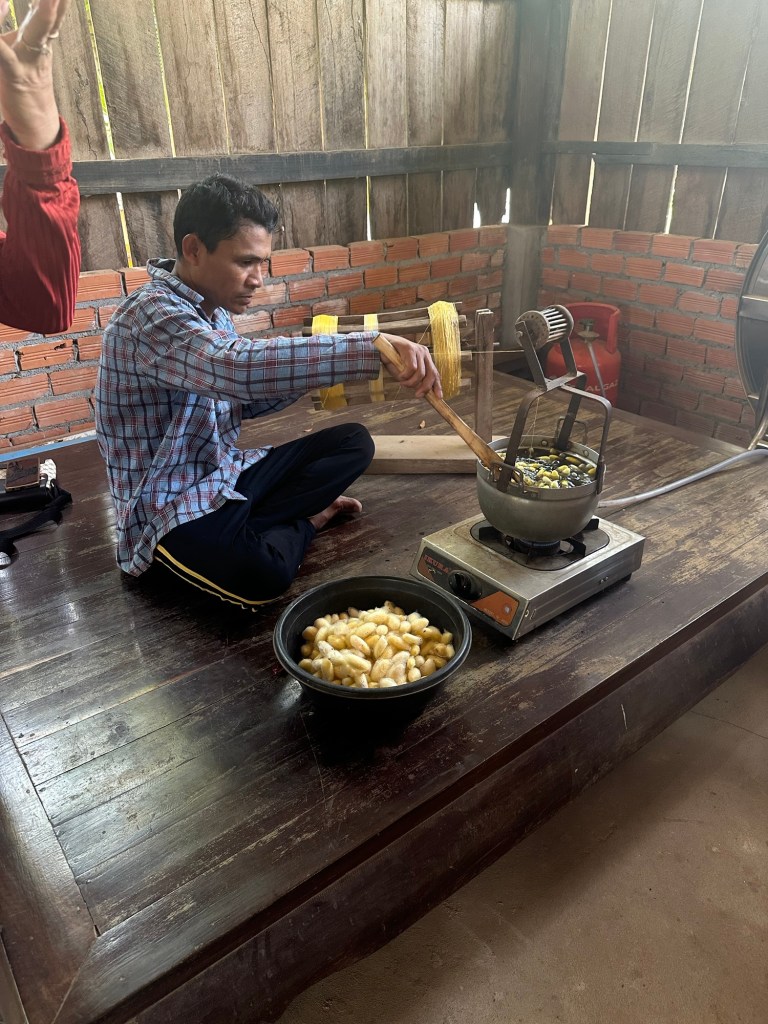 Later in the afternoon, we went out to a farming village nearby. We sat in a field in a veggie garden, and tried all different kinds of Cambodian snack foods made by the lady on the farm. Sureth talked to us about how rice is grown and about how they catch and eat the frogs, crabs, snakes and rats that live in the rice fields! Fortunately they were not on the menu today.